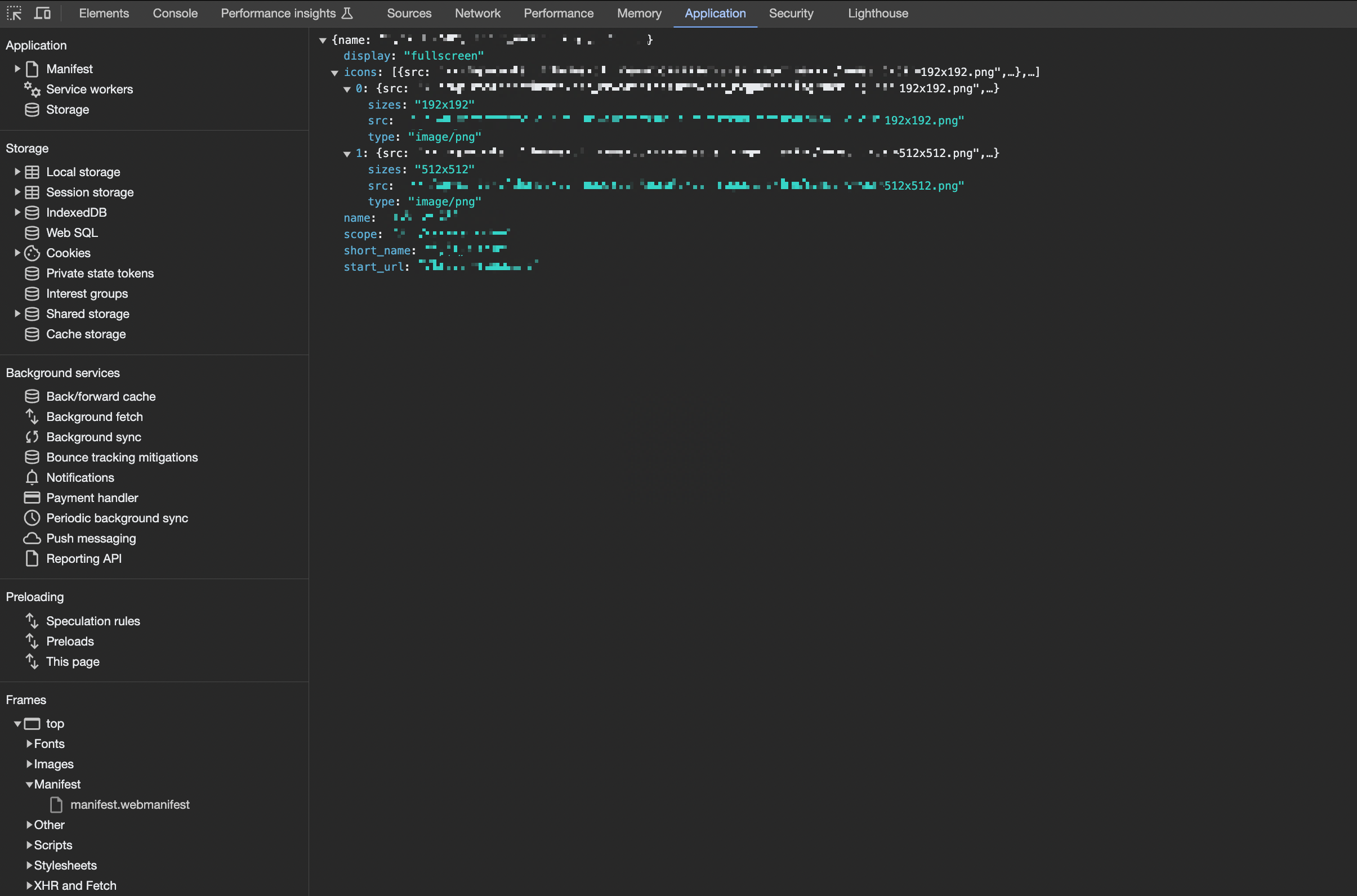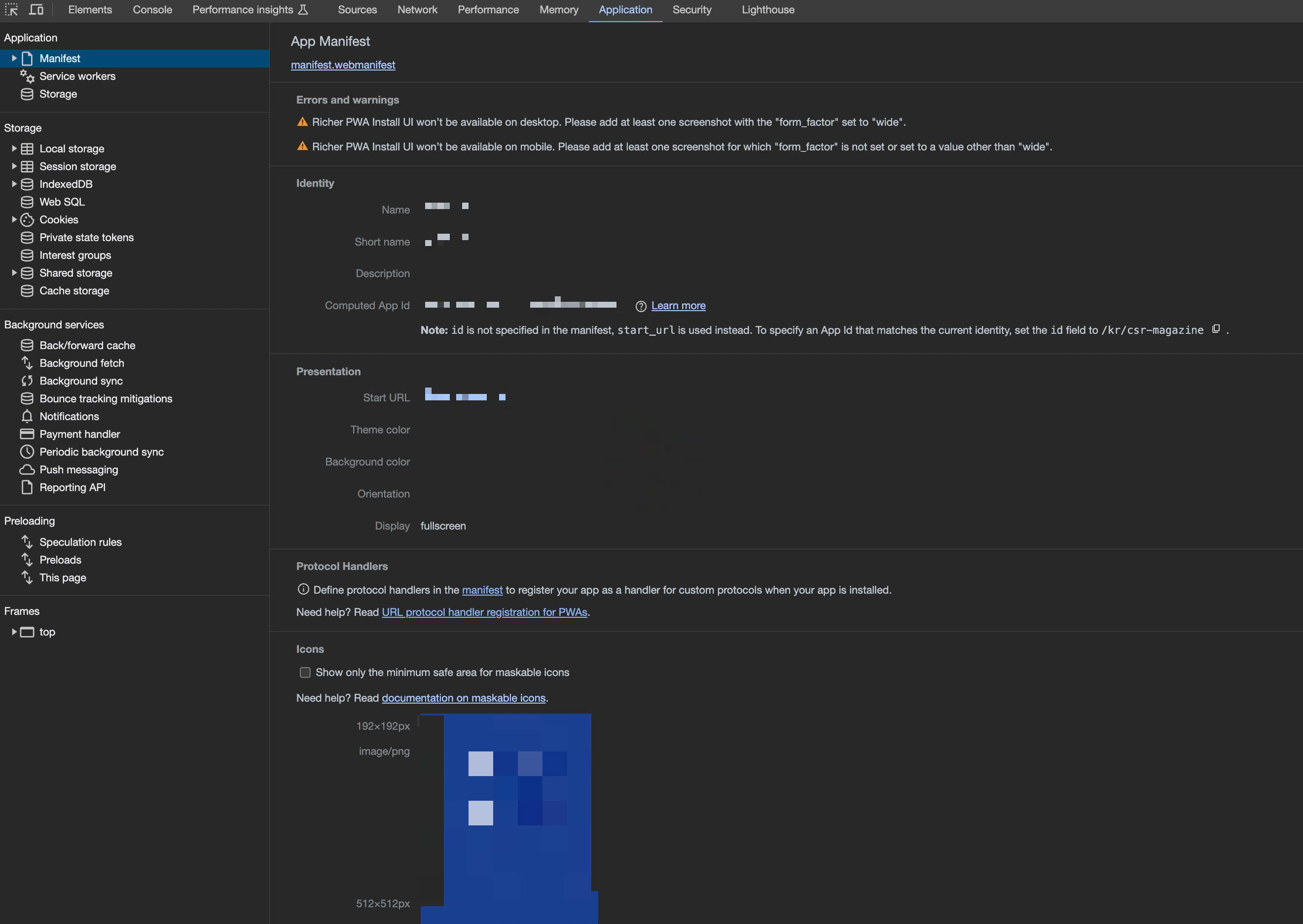 여기까지 등록이 잘 되었다면, PC 브라우저에서 웹사이트 로딩 후 개발자도구에서 manifest와 service worker를 확인할 수 있다.